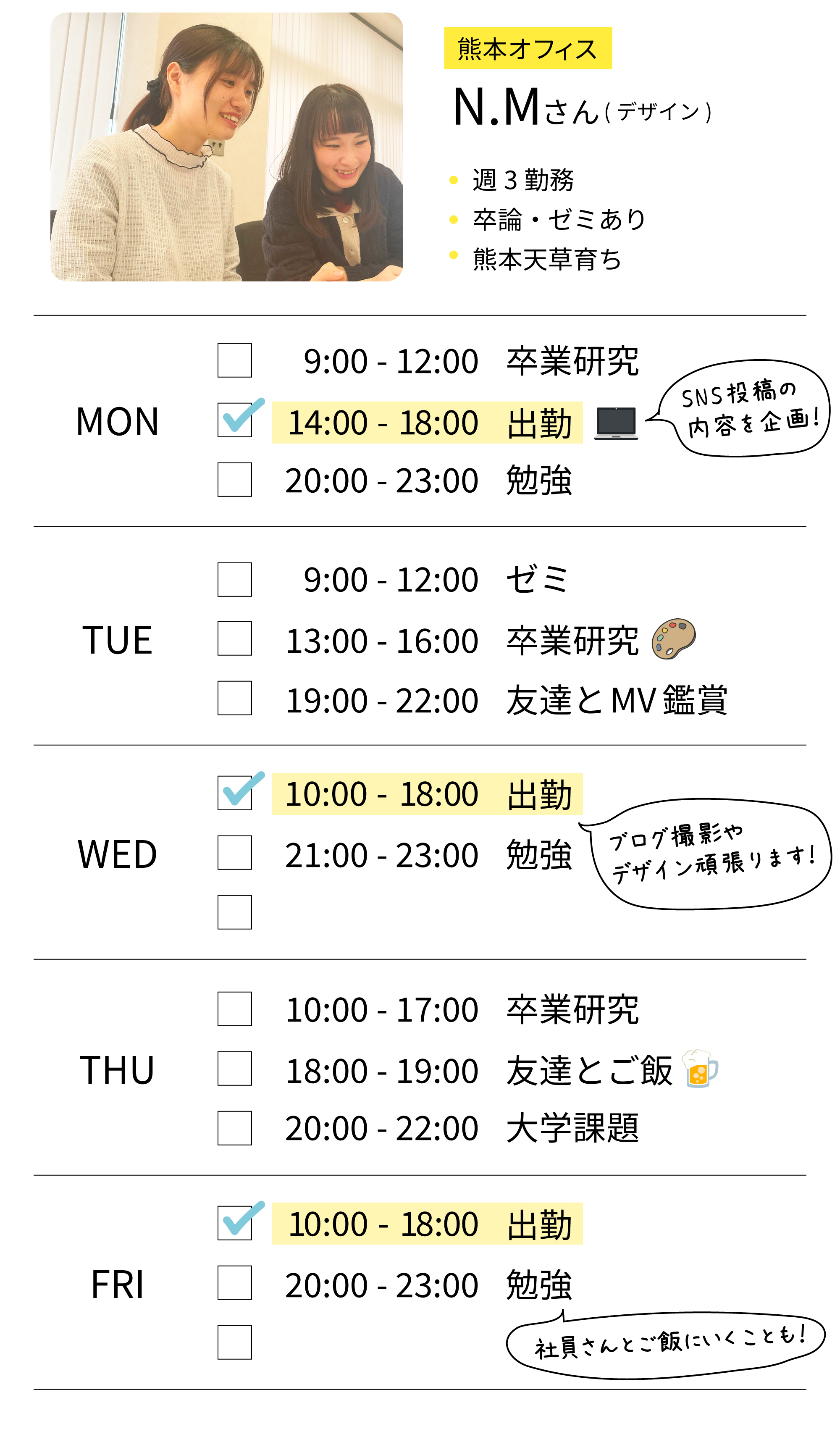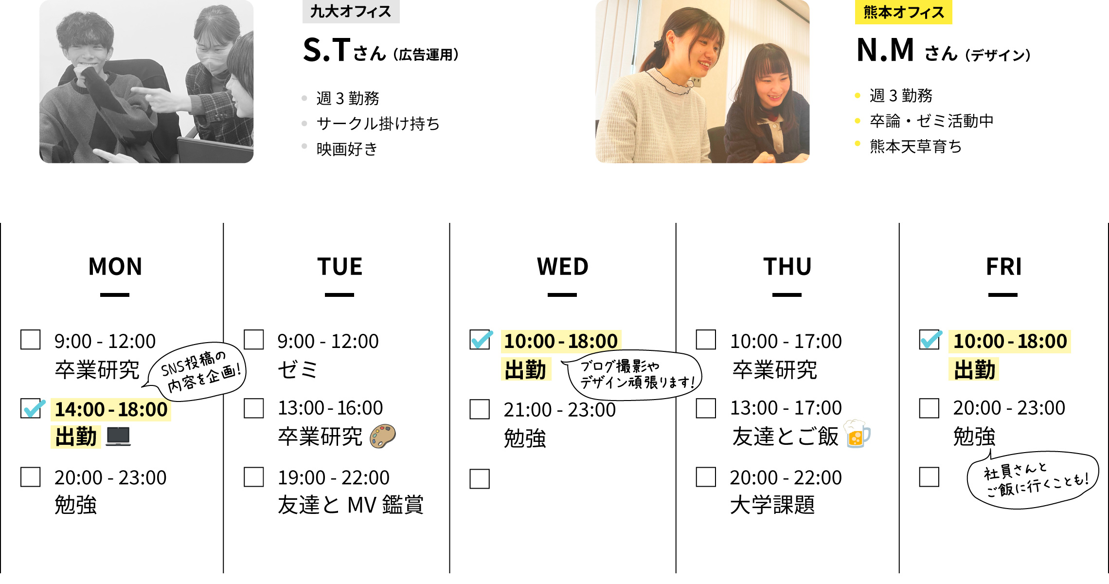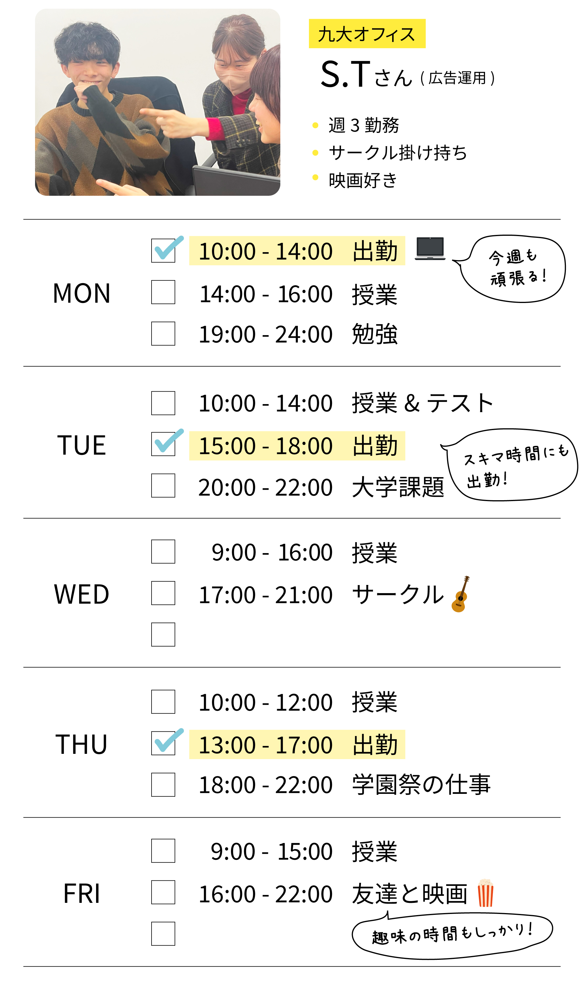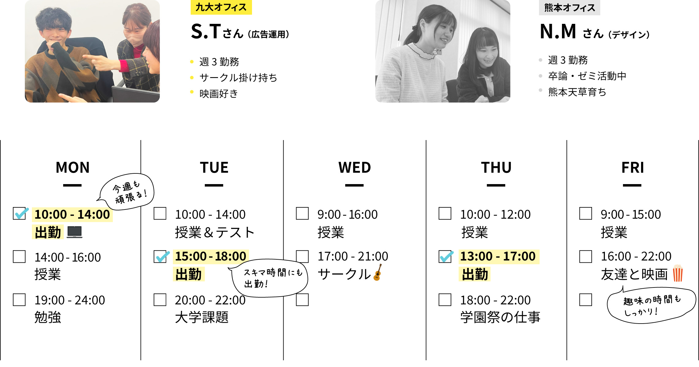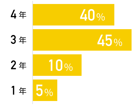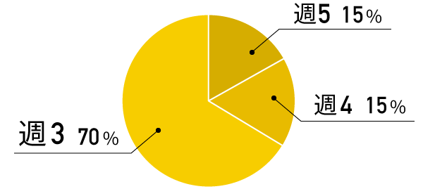 自分でシフトを決められるので柔軟に調整できます。テスト期間や就活時期は働く時間を減らすなど、学生生活を優先した働き方ができます。多くのインターン生が週3日以上で勤務しています。